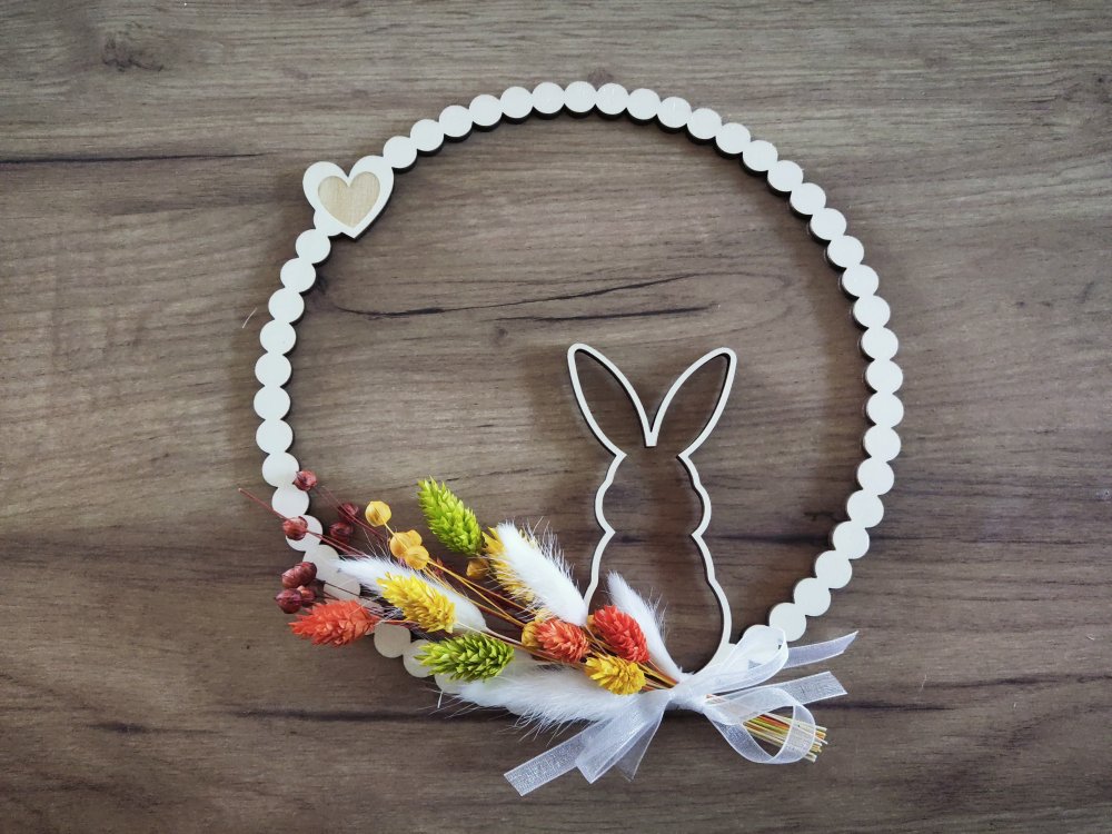 Tento dřevěný kruh s vyřezanými zajíčky je roztomilou a přírodní dekorací, která se skvěle hodí na vstupní dveře, stěnu nebo okno. S průměrem 21 cm a vyrobený z 4 mm topolové překližky je lehký, ale pevný, takže se snadno zavěsí i dozdobí.